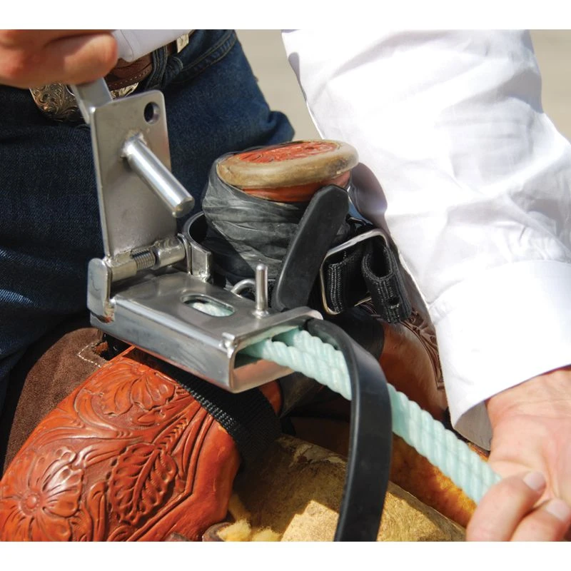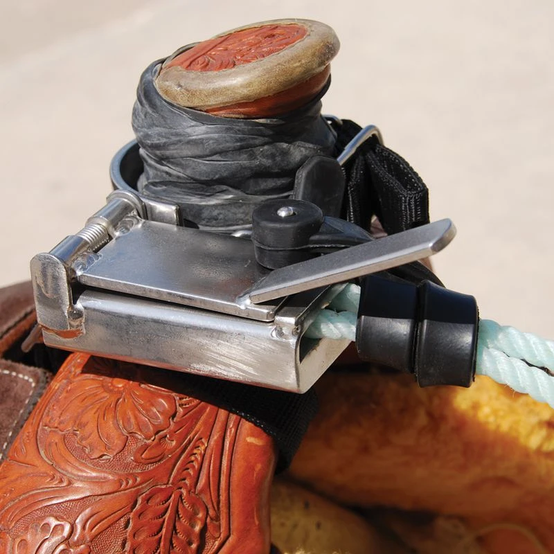 Quick Release and Roping Tool features a rubber strap that creates the dallying effect that gives this quick release its name. Your rope will slide through the Slyder and it will take that jerk away from your horse and the cattle which will cause your horse to stay collected. Two nylon straps allow you to adjust and tighten the quick release to your saddle for optimal security, Stainless steel made.Slyder is beneficial for anyone who ropes calves or steers. Their one of a kind product has been designed to eliminate the jerk and torque on the horses’ front end, while extending the consistency and roping life of each steer. Slyder is perfect for green horses, as well because it increases their feel of the tug on their back end. They will also become desensitized to the sound of the rope sliding through the quick release.