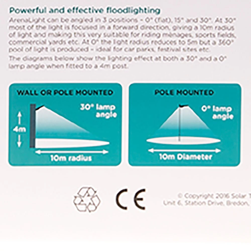 “SolarMate Arena Light is a 1000 lumen brightness flood lighting system that is self powered using its highly efficient solar cell and internal lithium battery pack. Arena has two operation modes: Motion Activated Mode – at dusk Arena shines at 50 lumens to provide ambient lighting but when it detects movement within 8m of its sensor, the brightness increases to 500 lumen to flood a 150sqm area. When the movement comes to an end or after 30 seconds, the light goes back to 50 lumens. Timed Illumination Mode – using the supplied remote control Arena can be set to work constantly for 1 hour or 2 hours. Once 2 hours has elapsed the timer can be reset again. Also the brightness can be increased from 500 lumens to 1000 lumens giving light coverage of 200sqm per light. Only six Arena Lights are all that is needed to flood and area of 40m x 20m with enough illumination for night time horse exercising or roping. Arena can be fitted direct to a wall or fence and is supplied with U bolts which enable it to be clamped to a standard scaffolding pole. Supplied with: 4 x expansion bolts (for solid wall fixing) 2 x U Bolts (for pole fixing) 1 x remote control and AAA batteries 1 x User manual”